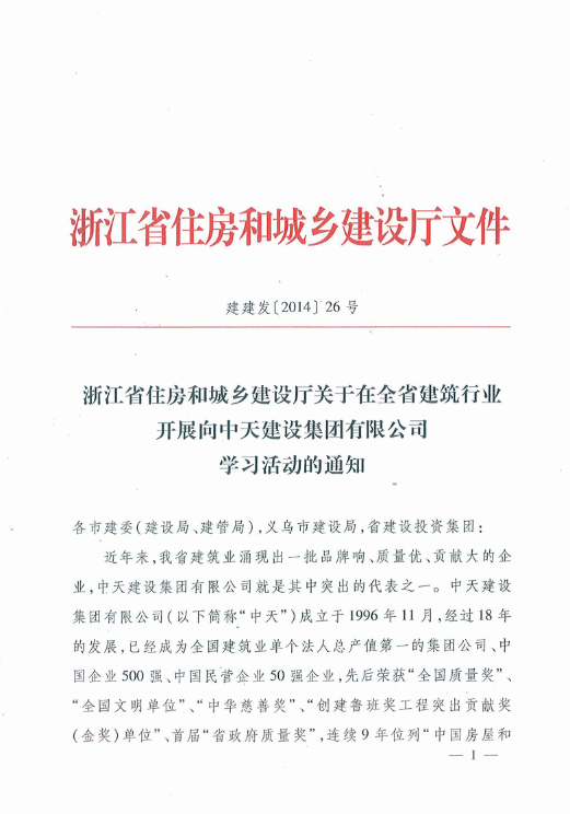 《浙江省住房和城乡建设厅关于在全省建筑行业开展向304am永利建设集团有限公司学习活动的通知》
